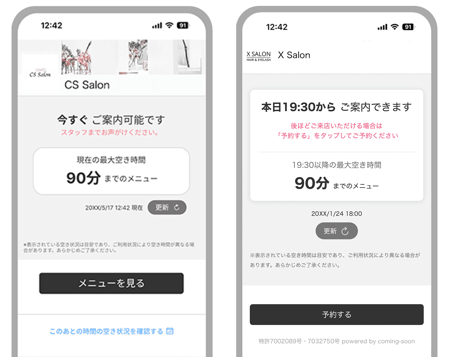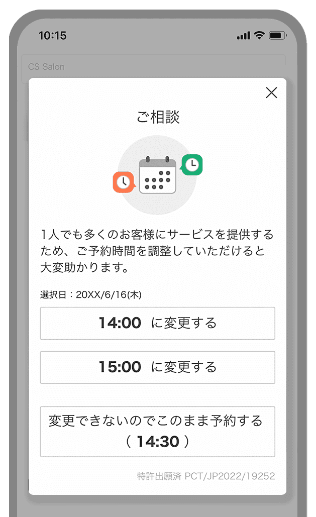 メニュー選択後に「希望する時間がない」という状況にならないよう、お客様の都合に合った空き状況を事前に確認でき、効率的に予約を進められます。
