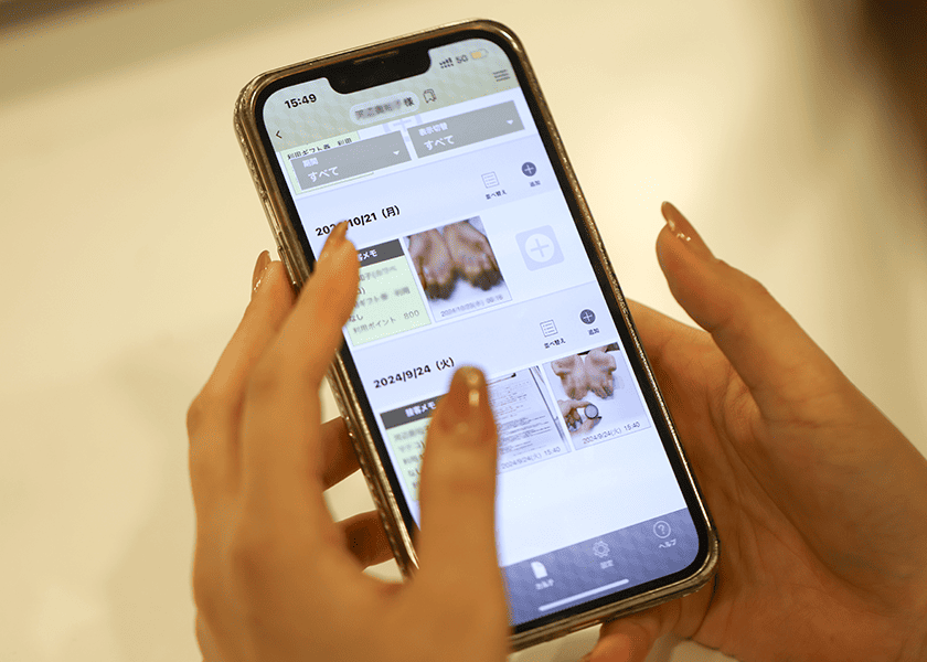 「電子カルテはネイルもアイラッシュも、施術後に撮った写真をそのまま一緒にカルテに貼り付けられるのでとても便利です。以前は紙で管理していましたが、更新・管理するのが大変でした。文字よりも一目瞭然で入力の手間もかからない。予約と連動しているのでカルテを探すムダもない。ご予約いただいたお客さんの履歴もボタン一つですぐに閲覧でき、情報共有も簡単です。」