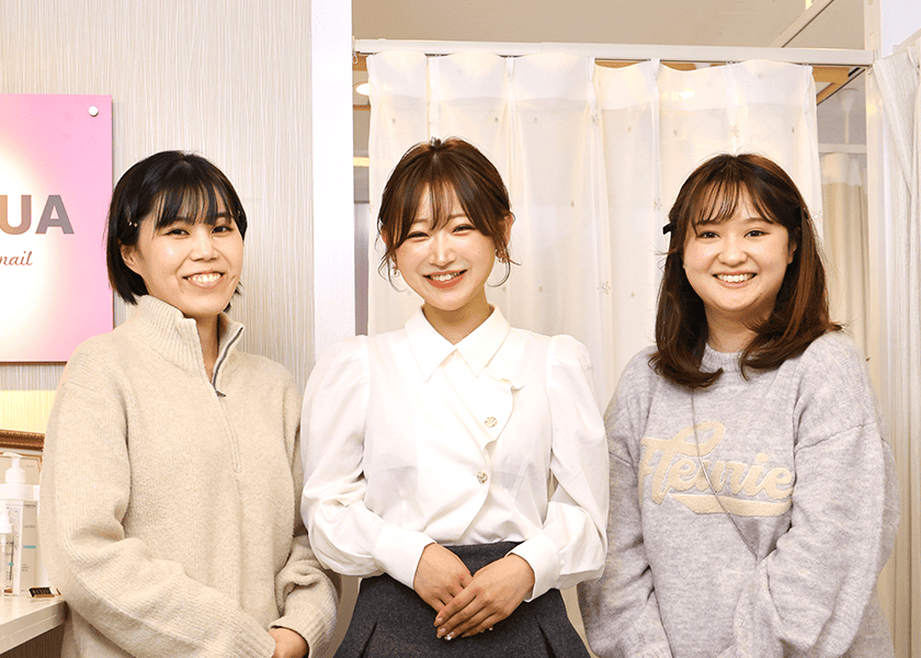 そんなRALUAは努力と勉強の甲斐あって『質の高いサロン』がお客様に浸透し、サロン激戦区の名駅にも関わらず、リピーターを獲得する人気店に。保母さんを支えてくれるスタッフも増え、ネイリスト4人、アイリスト3人の計7人のスタッフがともに働く。