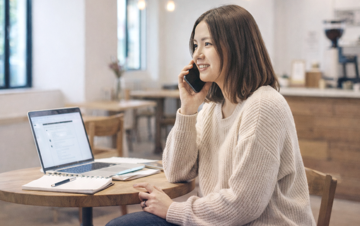 カフェで、隣の席の女性がサロンに予約の電話をしていて、パーマをするか悩んでいることを伝えた。そして「じゃー、それでお願いします!」と女性は言い、予約日時を決めて電話を切った。