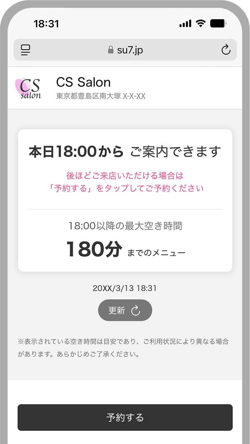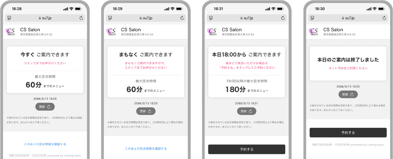 入店前に「今すぐ施術できるか」「満席なのか」がひと目で分かるため、スタッフに声をかける必要がなく、飛び込み来店の心理的ハードルを下げます。